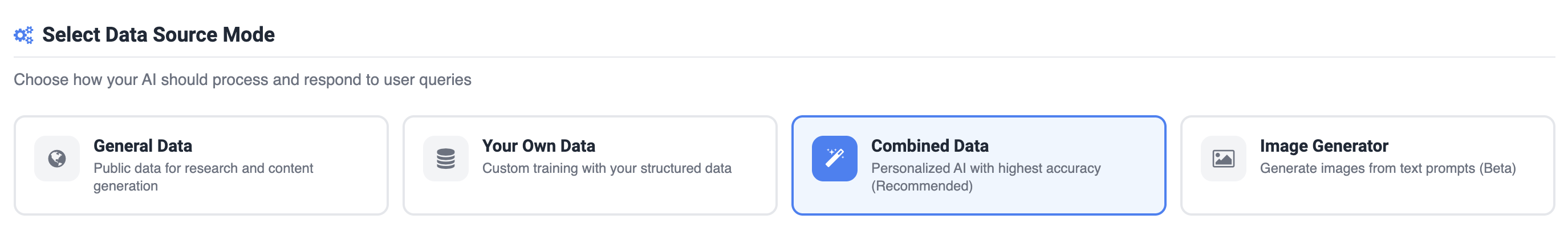Combined Data Mode is the setting where AI gives priority to the information you have uploaded for customization, ensuring that all responses and content creation are based on your data. This mode allows for small talk, meaning that casual greetings and farewells such as “hello” and “goodbye” will be acknowledged and answered suitably.