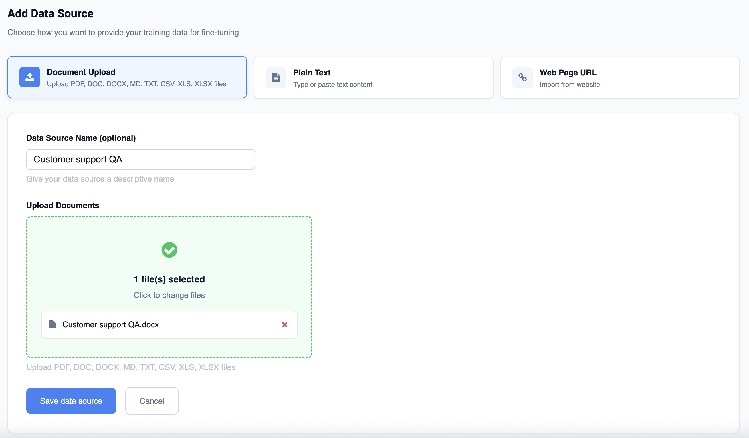 Document: Upload files in formats such as DOCX, PDF, XLSX, XSV, MD, TXT or JSON using the "Choose File" button or by dragging and dropping your files. We recommend adding one file at a time. If you'd like the AI to learn from multiple documents, create separate data sources for each.