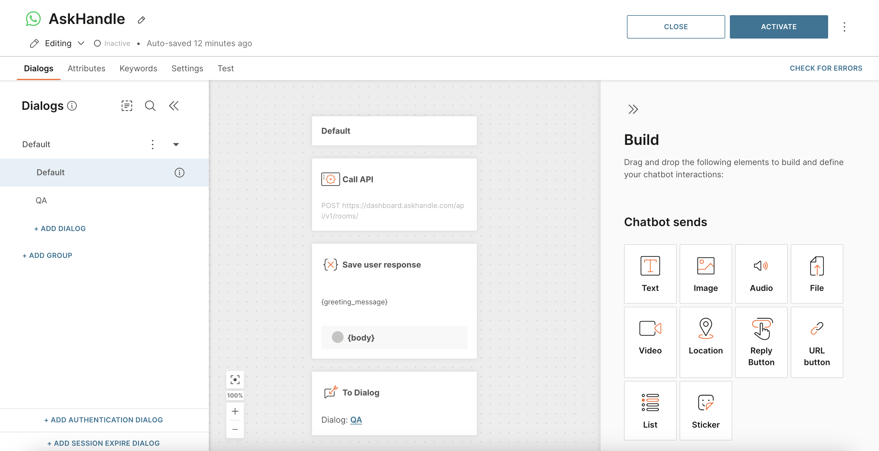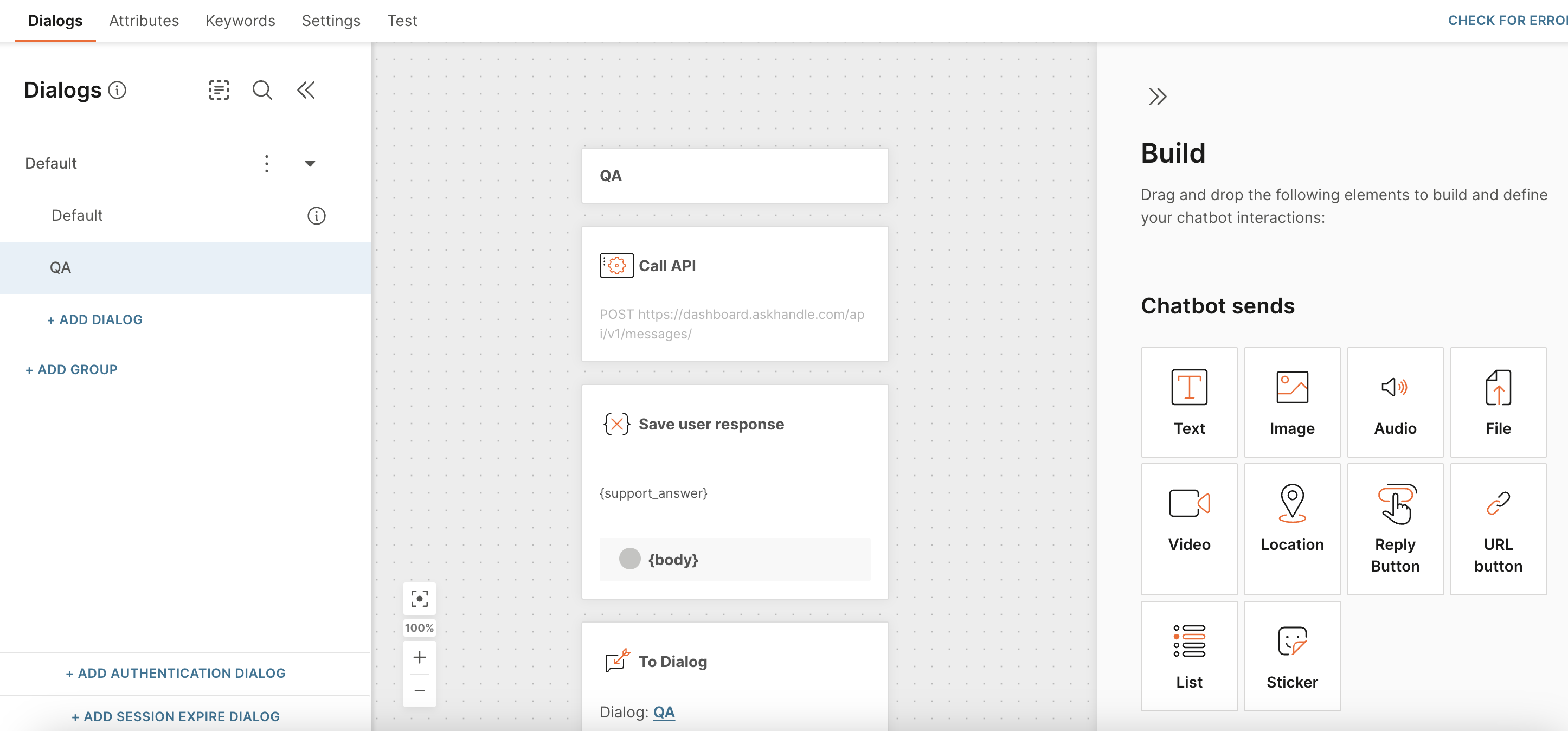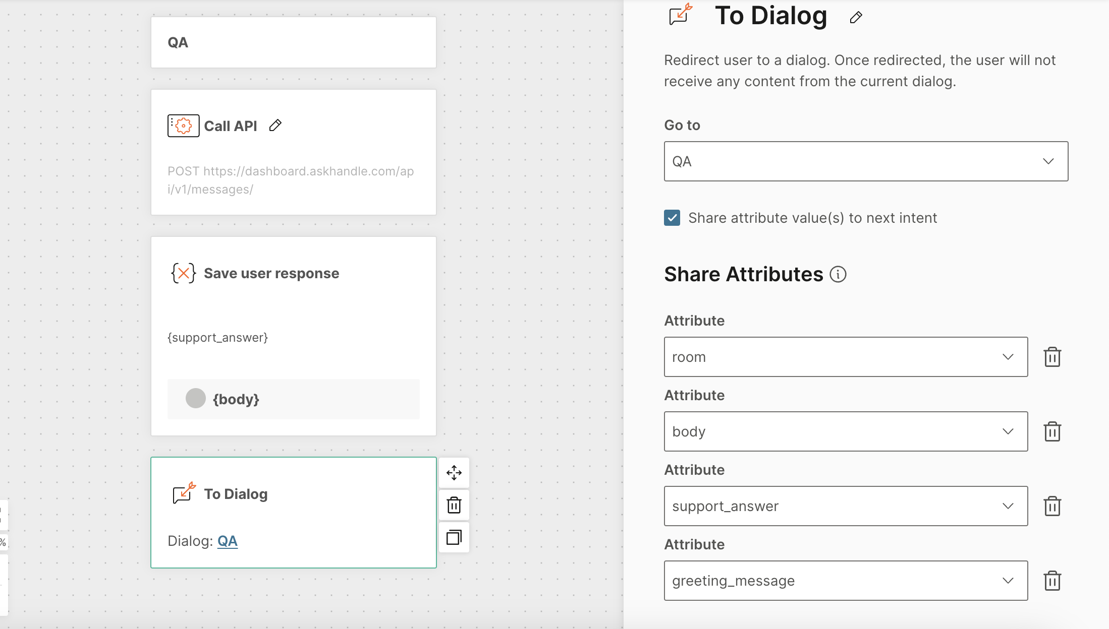 Now let’s configure the QA dialog, where AskHandle AI will provide responses.