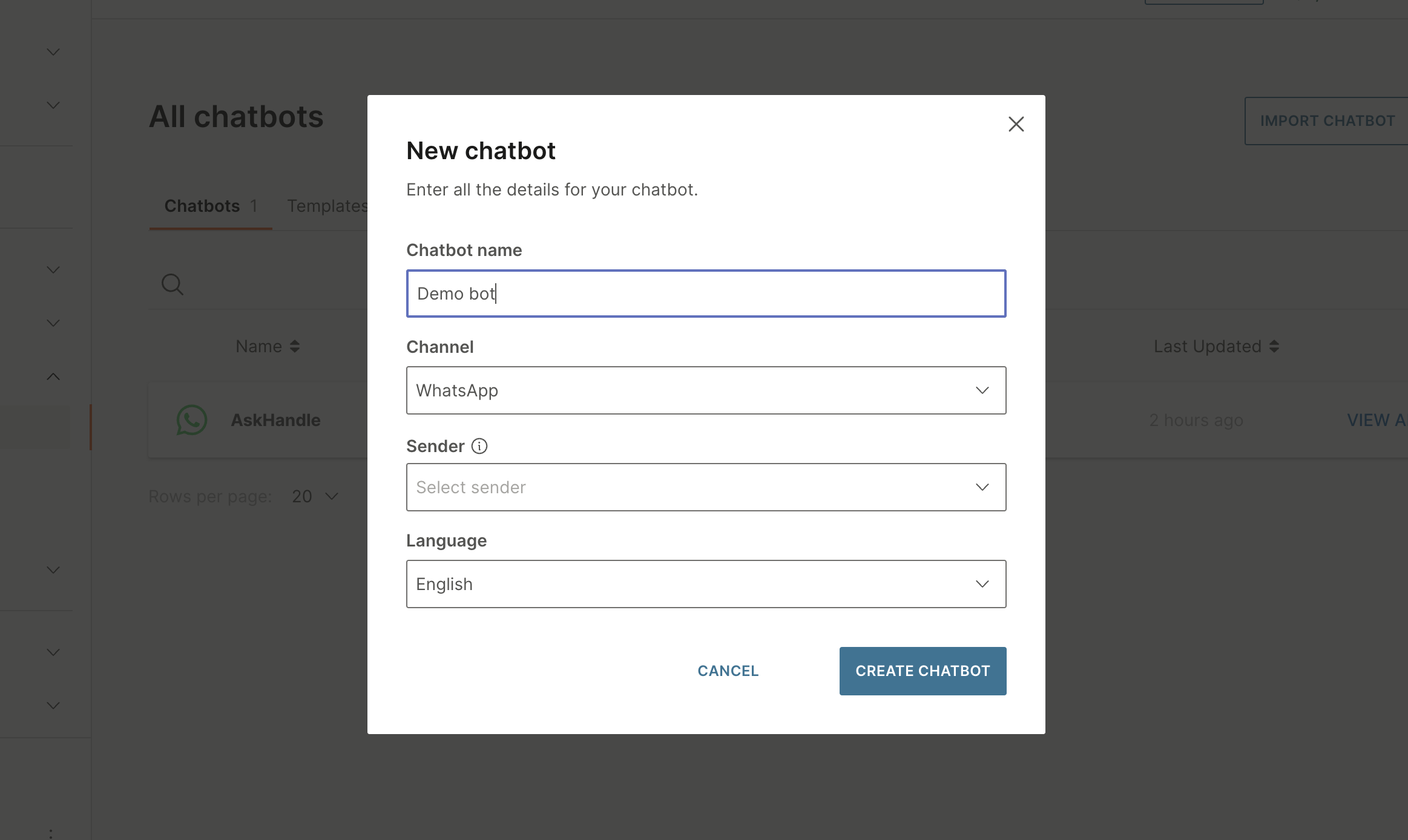 - Click on the New Chatbot button to create a new bot.