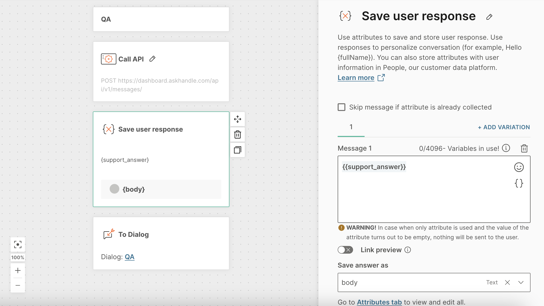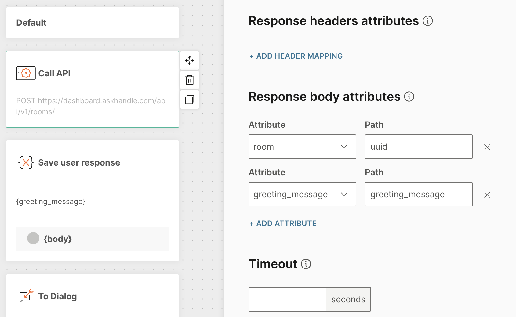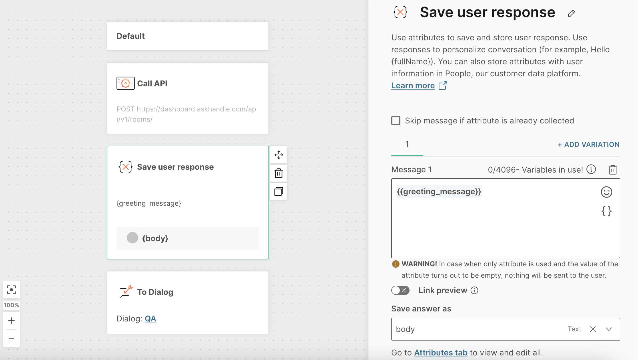 {}button and select thegreeting_messageattribute. (If you don't see it, go back to the API element and ensure the attribute is added correctly). - For Save answer as, create a new attribute called