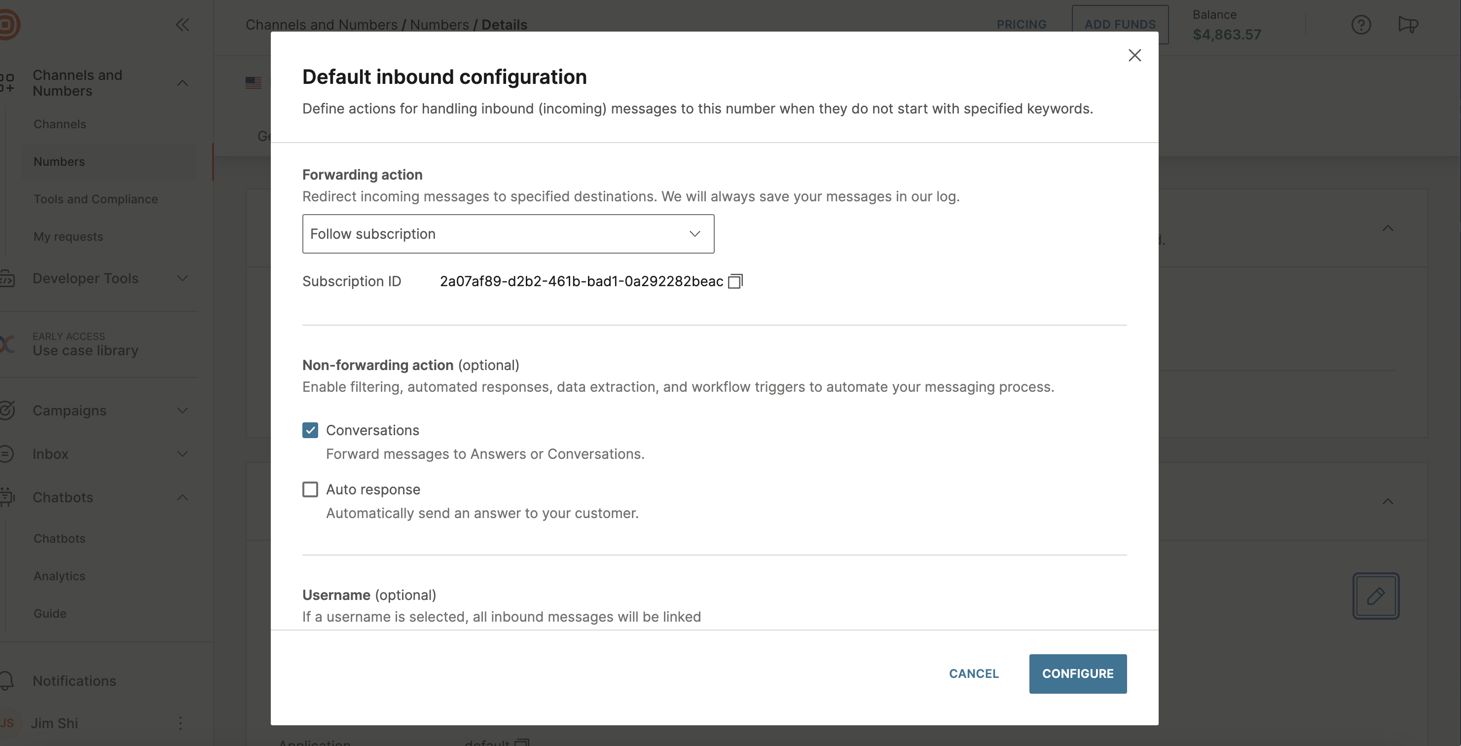 If you intend to use AskHandle AI with a real WhatsApp number, ensure that Conversations is enabled in the Default inbound configuration.