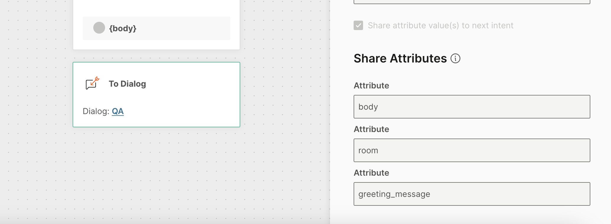 - In the Share attribute value(s) to next intent section, click ADD ATTRIBUTE and select the following: