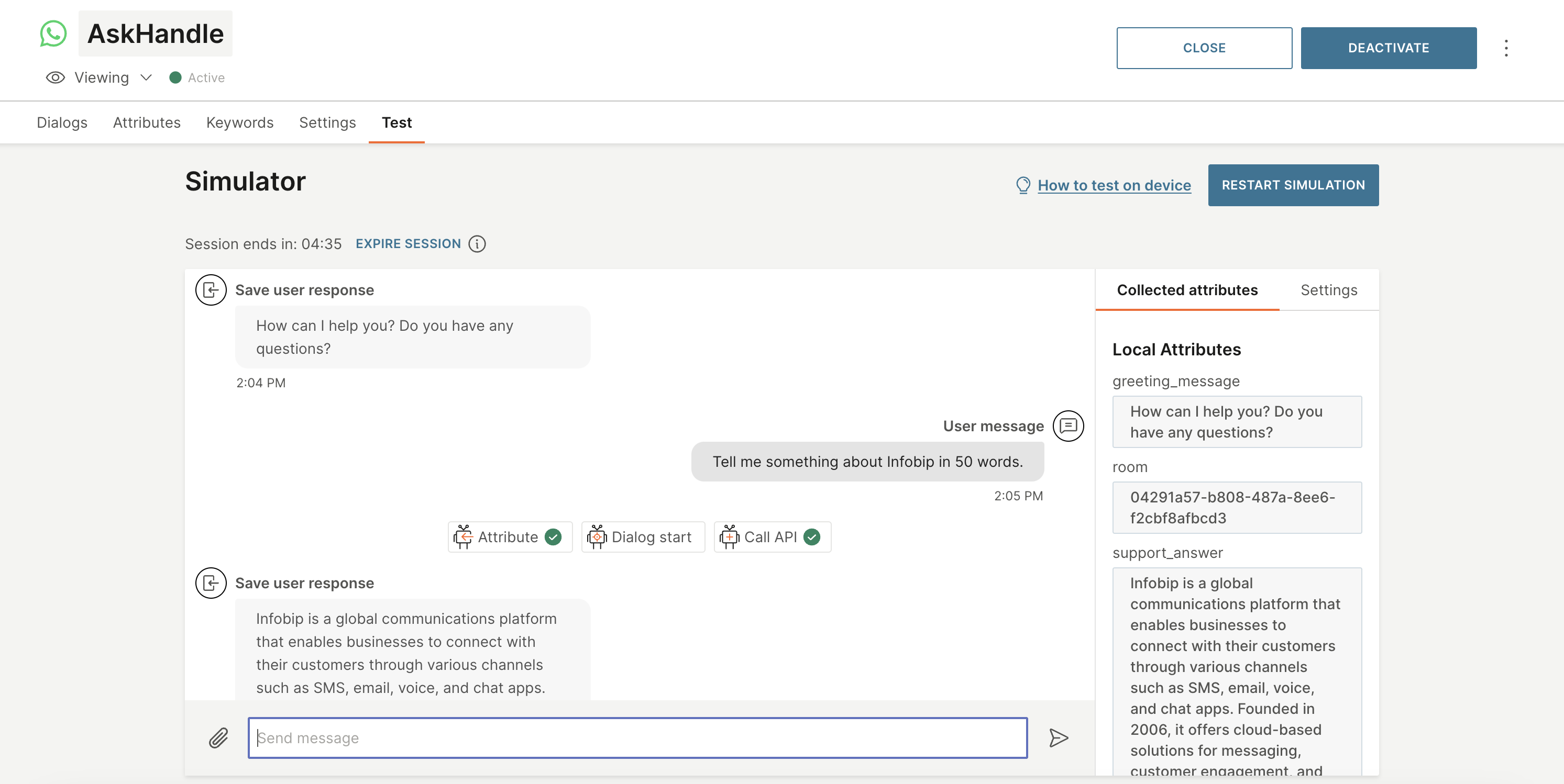 - Click START SIMULATION to initiate a conversation with AskHandle AI.
