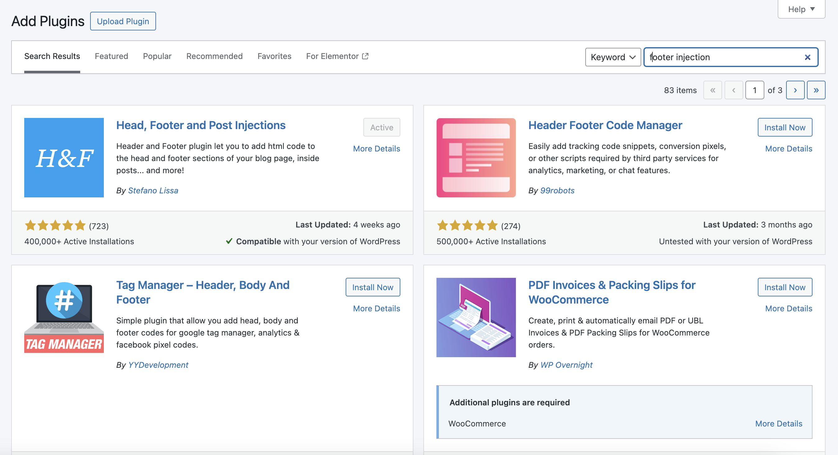 - You'll see several plugins listed. Choose "Head and Footer Scripts Inserter" (or your preferred plugin) from the search results.