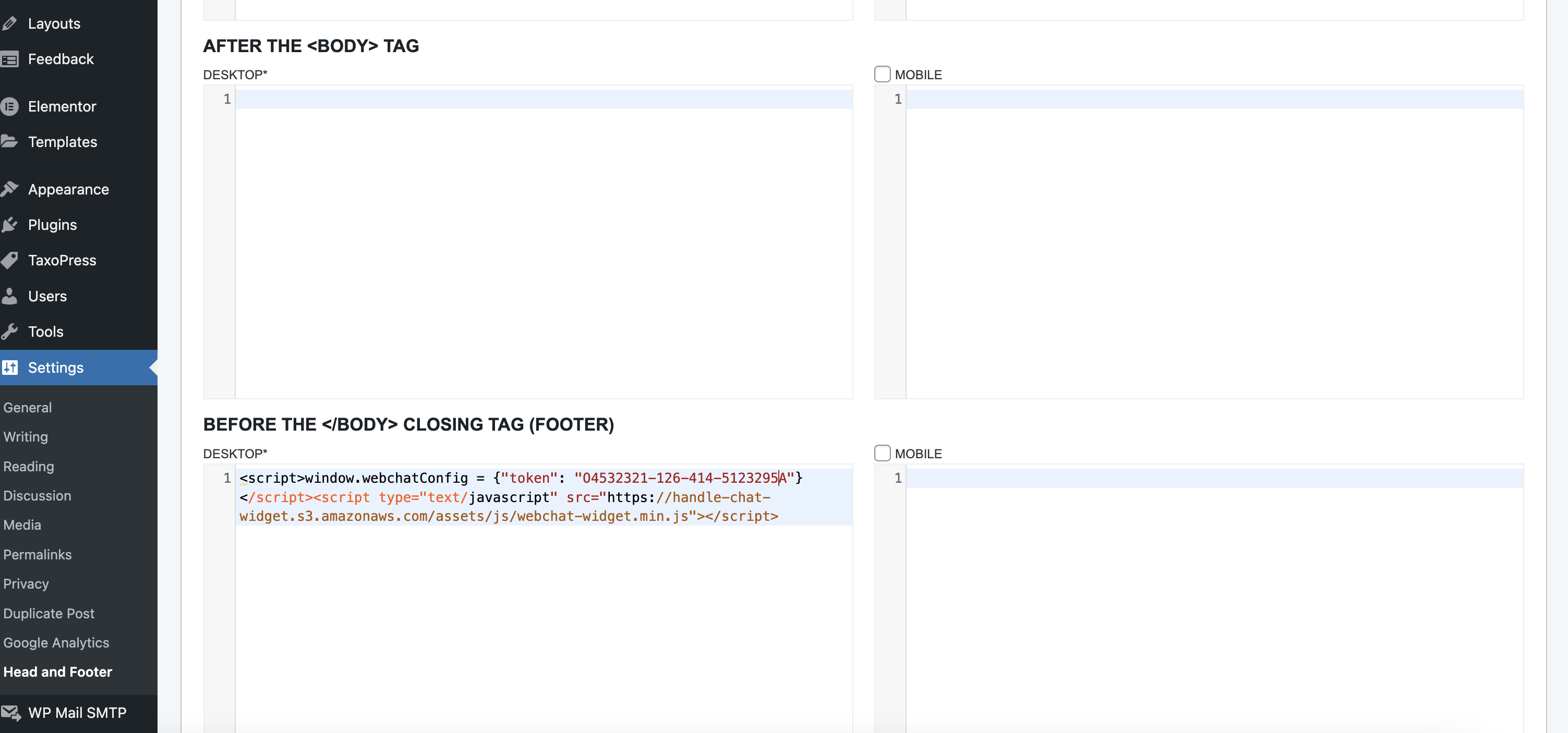 - Copy the JavaScript code provided to you by AskHandle and paste it into the "Scripts in Footer" field, just before the closing