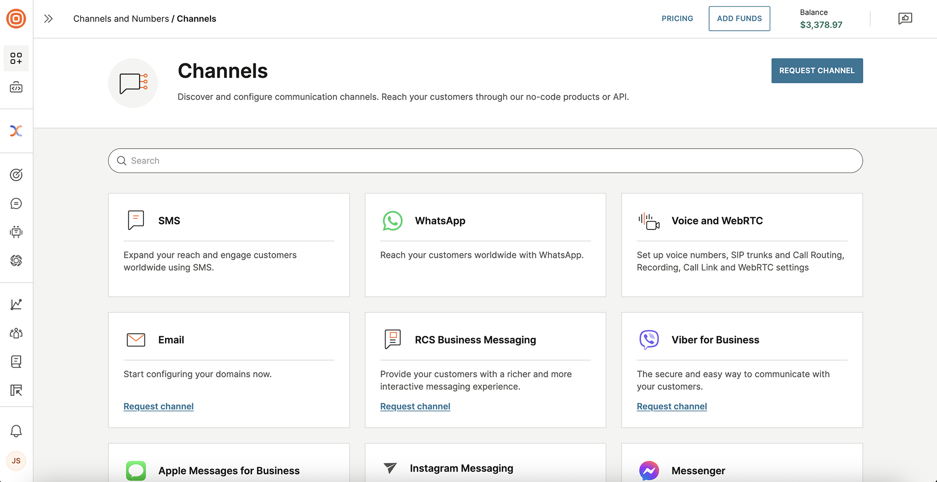 - From the Infobip dashboard, open the main menu on the left-hand side.